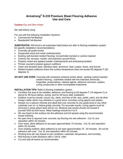 Armstrong S 235 Premium Sheet Flooring Adhesive Use And Care